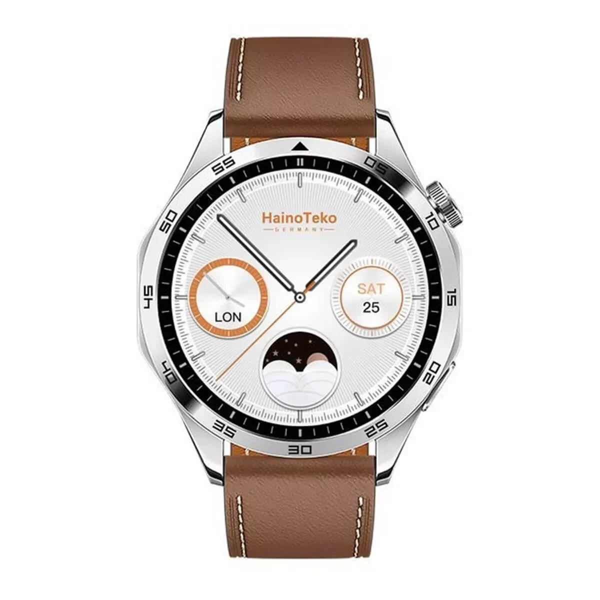 Introducing the ultimate combination of style, functionality, and convenience - the Haino Teko GT4 RW 44 Smartwatch with 3 pairs of straps to match your every mood and outfit. Crafted with a high-quality AMOLED screen, this smartwatch offers a crystal clear display that will make you stand out from the crowd. Choose from three pairs of straps - metal, silicone, and leather - to customize your smartwatch according to your personal style. Whether you're heading to a formal event or hitting the gym, the Haino Teko GT4 RW 44 Smartwatch has got you covered. With its magnetic wireless charger, you never have to worry about tangled cords or running out of battery. Simply place your smartwatch on the charger and it'll be ready to go in no time. But the Haino Teko GT4 RW 44 Smartwatch is not just a pretty face, it's also packed with features to make your life easier. Say hello to high-definition calls right from your wrist - no need to fumble for your phone. Plus, with quick and smooth controls, you can easily navigate through your apps and messages with just a swipe of your finger. Stay connected and in control with the Haino Teko GT4 RW 44 Smartwatch. It's not just a watch, it's a fashion statement and a must-have for anyone who wants to stay ahead of the game. Upgrade your tech game and never miss a beat with the Haino Teko GT4 RW 44 Smartwatch. Order now and experience the future of smartwatches!