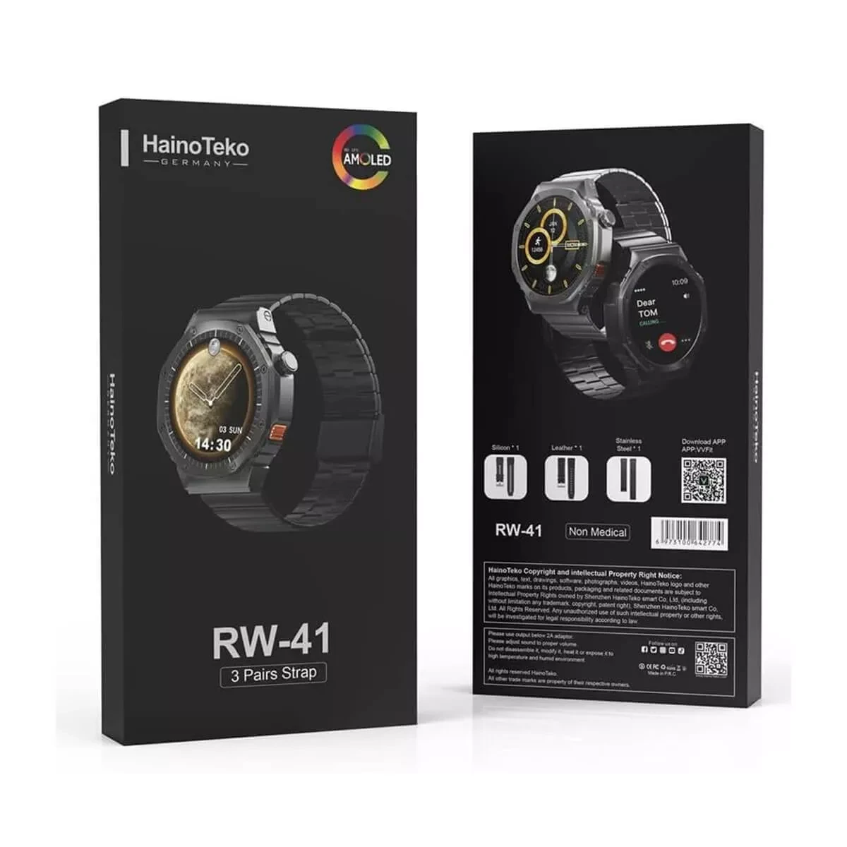 Introducing the ultimate must-have accessory for the tech-savvy trendsetter – the Haino Teko RW 41 smartwatch. With its sleek and stylish design, this smartwatch is not your average timepiece. It is a powerful tool that seamlessly connects you to the digital world, making your life easier and more convenient. Featuring an AMOLED HD screen, every glance at your wrist will feel like looking at a piece of art. The stunning display offers vibrant colors and high resolution, making it a pleasure to use for both work and play. Whether you're checking your schedule for the day, catching up on notifications, or tracking your fitness goals, the RW 41's screen provides a visually pleasing experience. But that's not all – the RW 41 comes with three pairs of straps, allowing you to easily change its look to match your outfit or mood. From classic black to fun and playful patterns, this smartwatch can adapt to any occasion effortlessly. Say goodbye to fumbling with your phone when a call comes – with calling support, you can answer and make calls directly from your wrist. Keep your phone safely tucked away and stay connected on the go. And when it comes to recharging your watch, simply place it on the wireless charger, eliminating the hassle of tangled cords. But let's not forget the most important feature of all – the RW 41 smartwatch is not just a stylish accessory, it is a practical and efficient tool that helps you stay organized and on top of your game. With its user-friendly interface and responsive controls, navigating through its features is a breeze. Get ready to impress with the Haino Teko RW 41 smartwatch – the perfect combination of fashion, function, and technology. Upgrade your wrist game and experience the future of timekeeping.